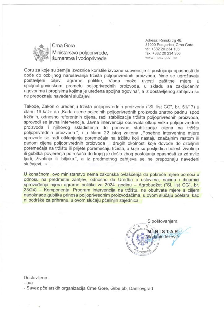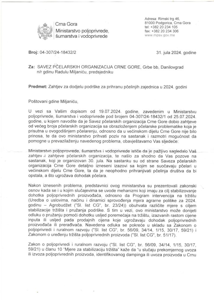 SPOCG: Odgovor na zahtjev za dodjelu podrške za prihranu pčelinjih zajednica 2024 27/08/2024 Poštovani pčelari,Dostavljamo odgovor Ministarstva poljoprivrede, šumarstva i vodoprivrede na Zahtjev za dodjelu podrške za prihranu pčelinjih zajednica u 2024. godini. preuzmi pdf preuzmi pdf